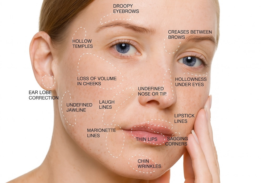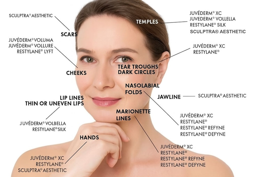 Temple rejuvenation, under eye bags/tear troughs/ dark circles, non-surgical nose job/non-surgical rhinoplasty, cheek enhancement, liquid face lift, under cheek hollowness, lip filler/lip augmentation, volume loss restoration, jawline rejuvenation, profile enhancement, chin shaping/chin augmentation, upper lip lines, hand rejuvenation, subcision, and so much more!